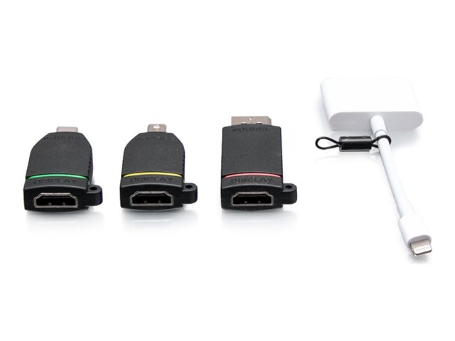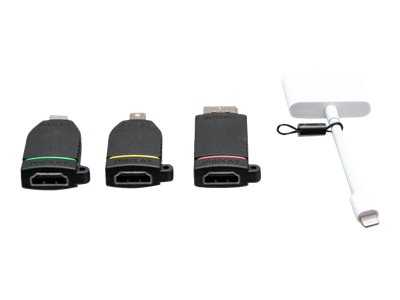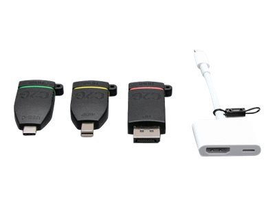 | Antall inkludert x Type | Video adapter - Mini DisplayPort (hann) til 19-pin HDMI type A (hunn) Video adapter - 20-pins DisplayPort (hann) til 19-pin HDMI type A (hunn) Video adapter - 24-pins USB-C (hann) til 19-pin HDMI type A (hunn) Video adapter - Lightning (hann) til 19-stifts HDMI type A / 24-stifts USB-C (hunn) |
