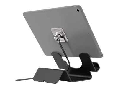Secured counter top stand with fixed optimal angle display for any tablet on the market. Keep your tablet secured and mobile with 6ft cable lock.